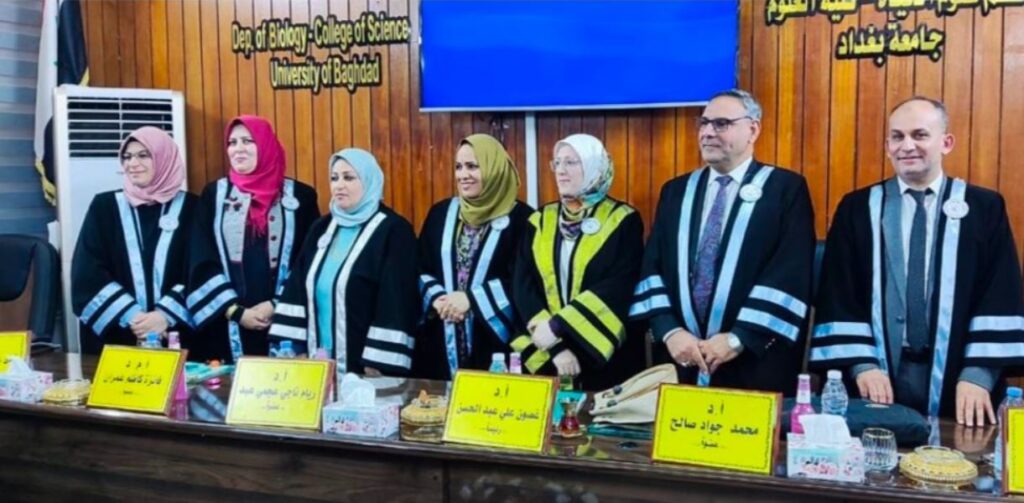 نوقشت في قسم علوم الحياة بكلية العلوم جامعة بغداد، اطروحة الدكتوراه الموسومة “التحري عن تلوث الهواء والثلوث الجرثومي في وحدات العناية المركزية للاطفال الخدج” للطالبة هند جبار عبد الرحمن اكرم واشراف الاستاذة المساعدة الدكتورة ندى عبد الرحمن فليح العيساوي .