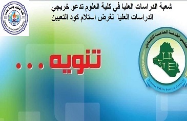 تدعو شعبة الدراسات العليا في كلية العلوم الى حضور حملة الشهادات العليا ( الماجستير والدكتوراه) الوجبة السادسة والمدرجة اسمائهم في الرابط، مراجعة الشعبة لغرض استلام الكود المرسل من مجلس الخدمة الاتحادي …