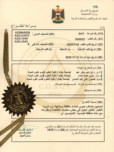 حصل التدريسيون الباحثون في قسم علوم الحياة بكلية العلوم جامعة بغداد كل من الاستاذ المساعد الدكتور ابراهيم جابر عبد والدكتورة ميس عماد احمد والدكتورة غصون علي عبد الحسن، على براءة اختراع عن بحثه الموسومة “دراسة تطبيقية مهمة في الصناعات الغذائية ( معلبات اللحوم) في العراق وذلك بحفظ اللحوم من التلف المايكروبي بأستخدام مواد عشبية طبيعية فعّالة ورخيصة” .