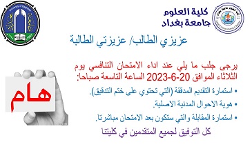 تعلن شعبة الدراسات العليا في كلية العلوم، عن اسماء الطلبة المسموح لهم لاداء الامتحان التنافسي للعام الدراسي 2023-2024 يوم الثلاثاء العشرين من حزيران التاسعة صباحا