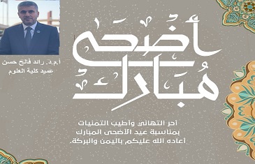 نهنئ الامة الاسلامية جميعا والشعب العراقي الكريم ومنتسبي عمادة كلية العلوم من تدريسيين واداريين وطلبة، بعيد الأضحى المبارك وأيام الحج المباركة ونغتنم هذه المناسبة لنعرب عن خالص الدعاء بأن ينعم الله على عراقنا الحبيب بالخير والازدهار وأن يعيد هذا العيد السعيد أياما وأعواما مملوءة بالتوفيق والنجاح .