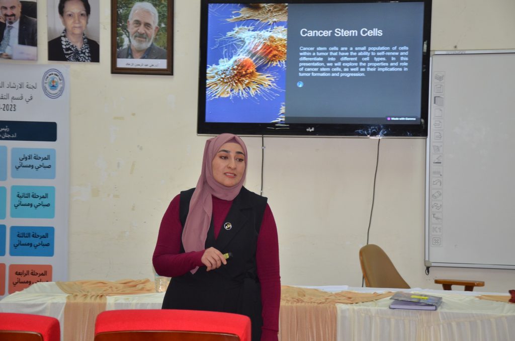 وتضمنت المحاضرة التي قدمتها المدرسة المساعدة اديان خالد استعراض الخلايا الجذعية السرطانية وتأثيرها على العلاج، مبينة يعد وجودها في الاورام سببا لتحديات اضافية في علاج السرطان، إذ قد تكون هذه الخلايا اقل استجابة للعلاج التقليدي وتؤدي دورا في اعادة تكوين الاورام بعد العلاج مما جعلها مثار جدل في البحوث العلمية عبر تطوير استراتيجيات جديدة لاستهداف هذه الخلايا بشكل فعال بهدف تعزيز فعالية العلاج السرطاني ومحاولة لفهم التفاعلات الجزيئية والميكانيز التي تسهم في استمرارية نمو الاورام .