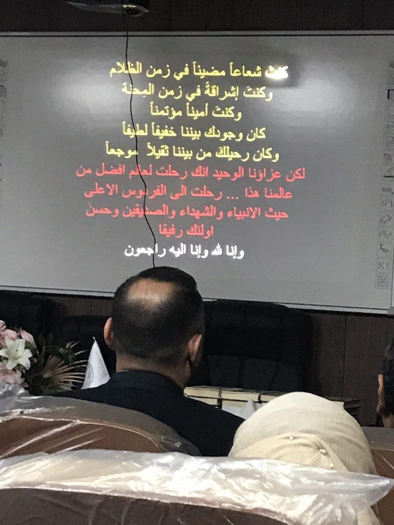 وتضمن الحفل التابيني، قراءة سورة الفاتحة على روح الفقيد وكلمات افتتحها رئيس القسم، اعربوا فيها عن عميق حزنهم بفقدان احد قامات قسم الفيزياء، بعد مسيرة حافلة بالعطاء، تاركا سيرة عطرة وروحا نقية ونهرا متدفقا من العلم والمعرفة، مبينين ان الفقيد من التدريسيين المخلصين بما قدمه من علم ووقت وجهد وتفاني وغرسه لحب العلم والمعرفة والخير للانسانية، اذ كانت مدة مسيرته ايقونة للعلم بما يحمله من نقاء للقلب وعطاء، مقدما كل مالديه من رسالة سامية حملها في طيات المعاني الانسانية النبيلة، وستبقى مأثره نبراسا وقدوة حسنة للاساتذة والطلبة بعد ان اسهم في تخريج العشرات، تاركا وراءه اجيالا من الباحثين والدارسين والطلبة والاساتذة .