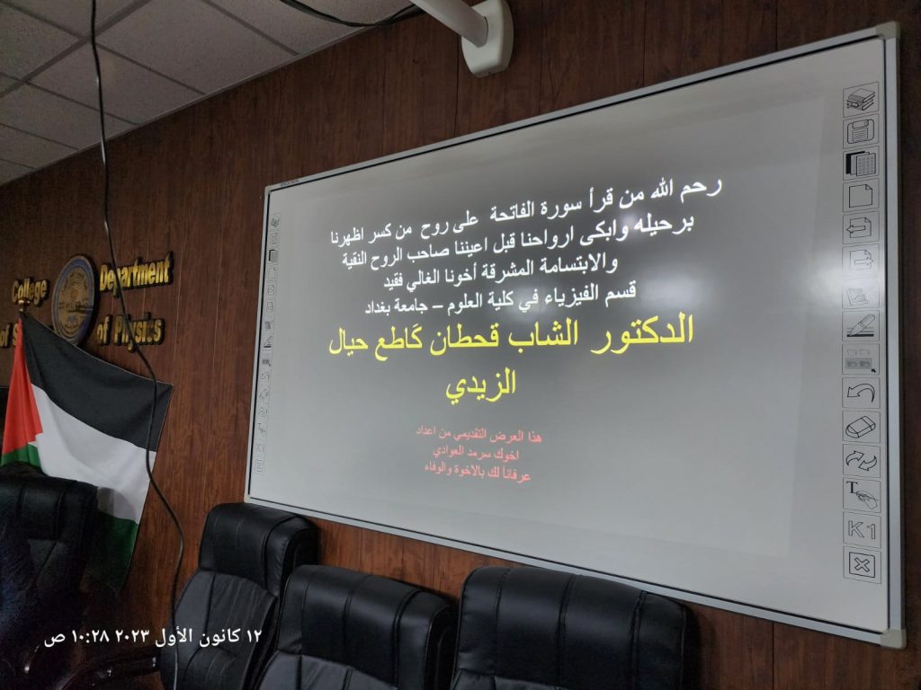 اقام قسم الفيزياء في كلية العلوم بجامعة بغداد، حفلا تأبينيا لمناسبة رحيل قحطان كاطع حيال الزيدي، التدريسي في القسم المذكور، وذلك بحضور معاون عميد الكلية للشؤون الادارية الاستاذ المساعد الدكتور اكرم نوري صادق، وعدد من الطلبة والتدريسيين .