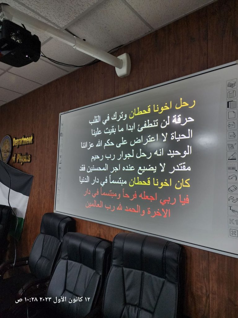ومن جانبهم عبر تدريسيو قسم الفيزياء، عن خالص عزائهم وحزنهم العميق لفقدان مربي وتدريسي فاضل، كانت له بصمة لا تنسى بين طلبته وزملائه وخريجيه، مبينين انه كان إبا واستاذا ومربيا لطلبته وأخا وصديقا وسندا لزملائه، ومثالا للخلق الرفيع والايثار، سائلين الله ان يرحمه برحمته الواسعة ويسكنه فسيح جناته .