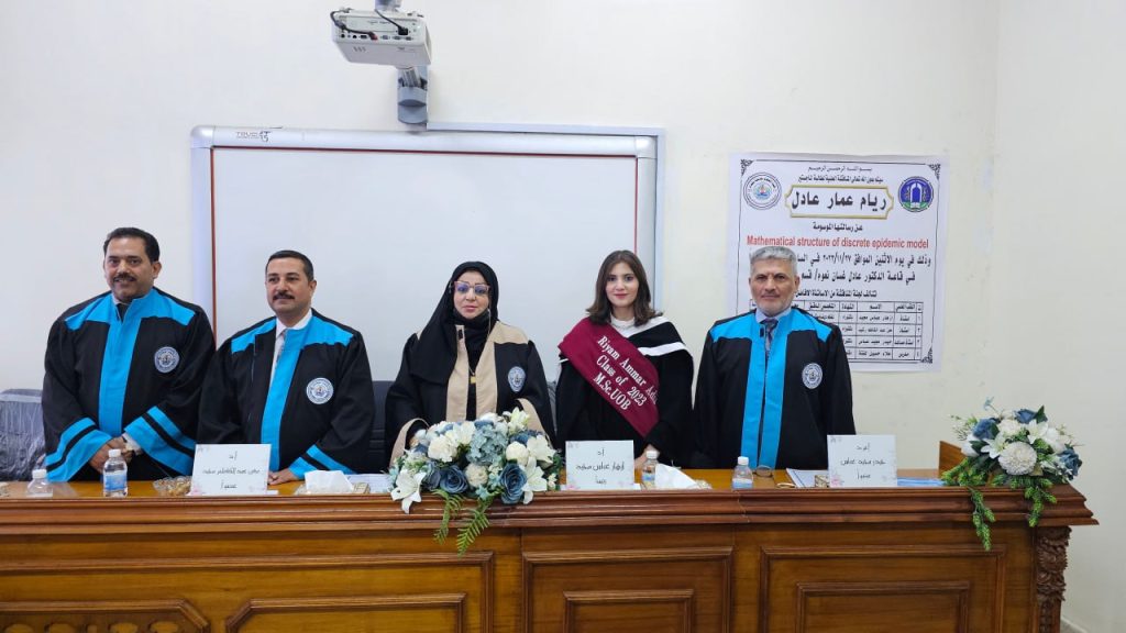 جرت في قسم الرياضيات بكلية العلوم جامعة بغداد، مناقشة رسالة الماجستير الموسومة “البنية الرياضية لنموذج وبائي متقطع” للطالبة ريام عمار عادل واشراف الدكتور علاء حسين لفته.