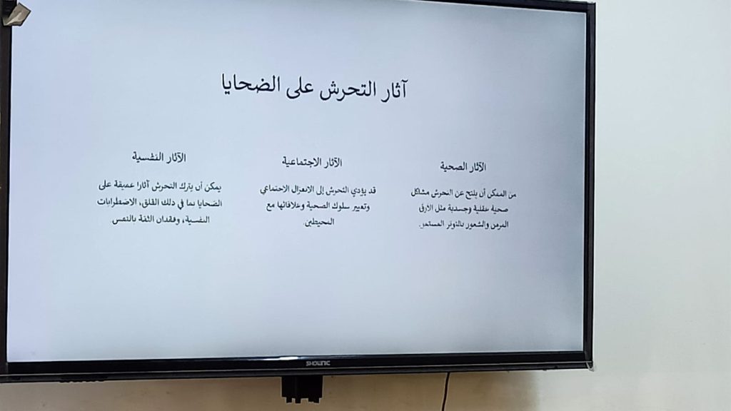 وهدفت ورشة العمل الى التعريف بمفهوم ظاهرة التحرش وأنواعه وأسبابه وبيان سبل معالجة هذه الظاهرة، وإيضاح النصوص القانونية التي تضمن حق الضحية وتردع المتحرش، فضلا عن امكانية تحصين الأفراد ولاسيما الأطفال روحياً وداخلياً ضد الانحراف لتوعية الجمهور بكيفية مواجهة هذه الظاهرة المشينة