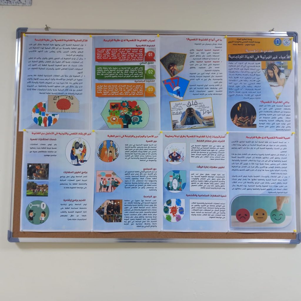 نظمت وحدتي شؤون المرأة والإرشاد النفسي والتوجيه التربوي بالتعاون مع شعبة الإعلام، حملة توعية تطوعية للحد من الضغوط النفسية التي يواجهها طلبة الجامعة حملت عنوان “الأعباء غير المرئية في الحياة الجامعية”.