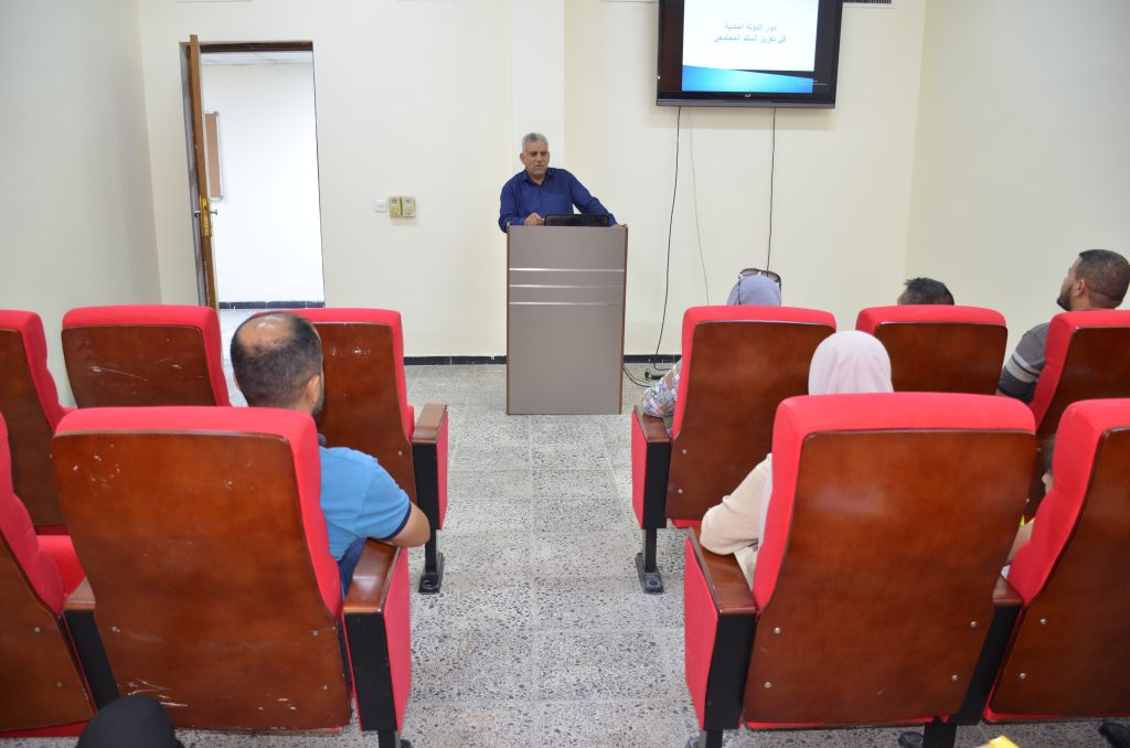 وتضمنت الندوة التي قدمها الدكتور انور اسماعيل خليل الى مناقشة اصول الدولة المدنية وجذورها الفكرية عبر التاريخ ومقومات الدولة المدنية والياتها والسلم المجتمعي ومقوماته والعلاقة بين الدولة المدنية وتعزيز السلم المجتمعي، مبينا ان الدولة المدنية لا يقصد بها الدولة المنغلقة، بل في الدولة بمفهومها الحديث على أسس عدة، كالمواطنة، وسيادة القانون، وعدم التميز بين المواطنين، واحترام حقوق الانسان، والتداول السلمي للسلطة، وتحقيق العدالة والمساواة وحفظ الأمن وسلامة افراد المجتمع جميعهم، مشيرا الى ان المختصون في هذا الشأن يشيرون على اهمية الدولة المدنية في تحقيق السلم المجتمعي، والذي يمكن ان تحققه عن طريق تلك الاليات المختلفة التي يمكن ان تمتلكها الدولة المدنية: كالسياسية، والقانونية، والاقتصادية والاجتماعية .