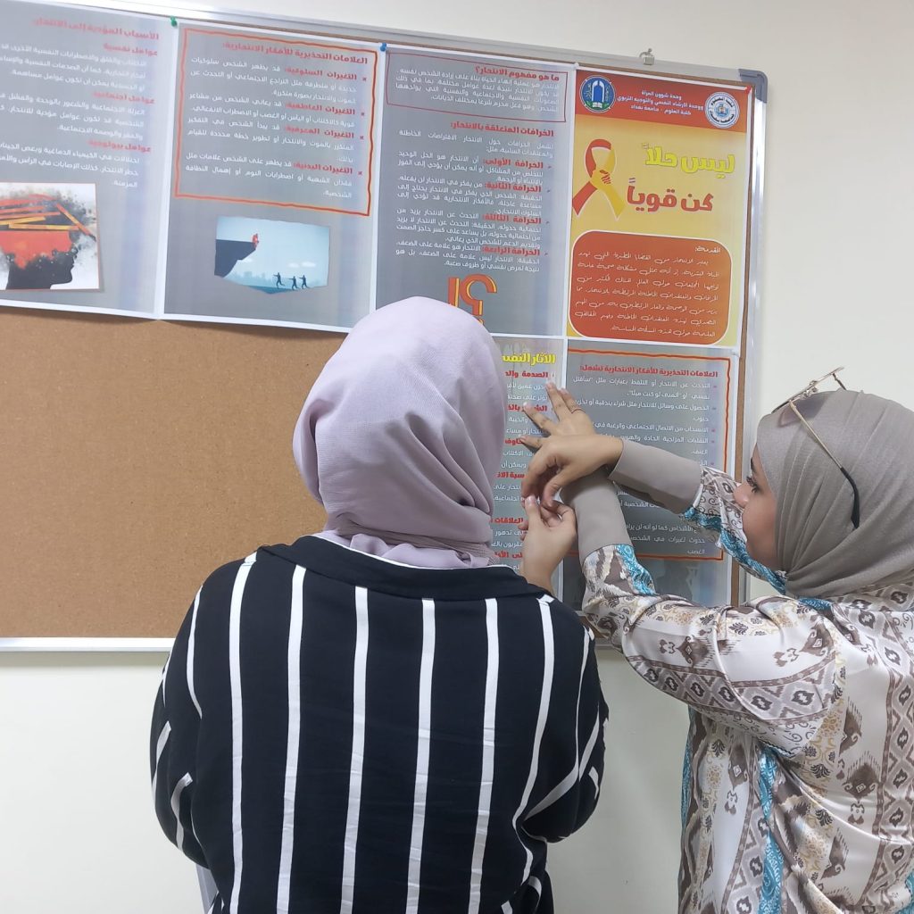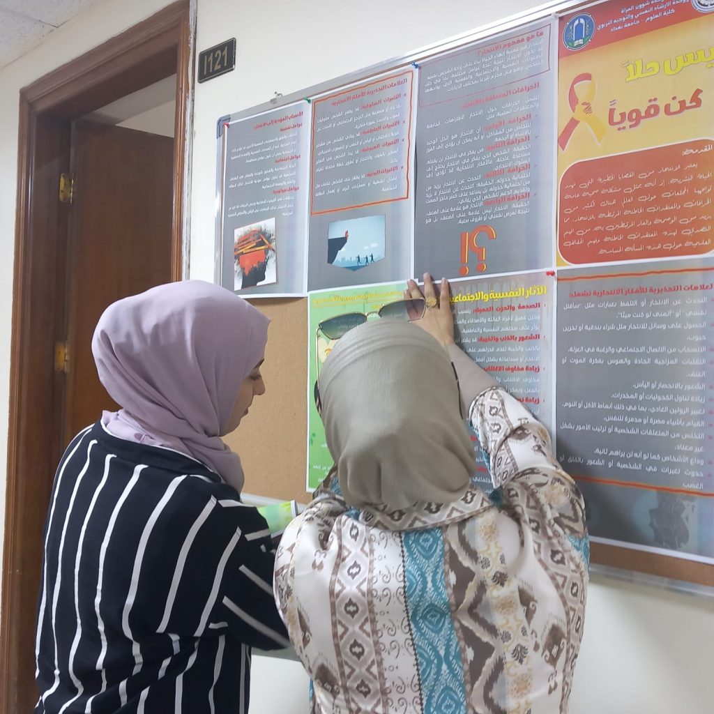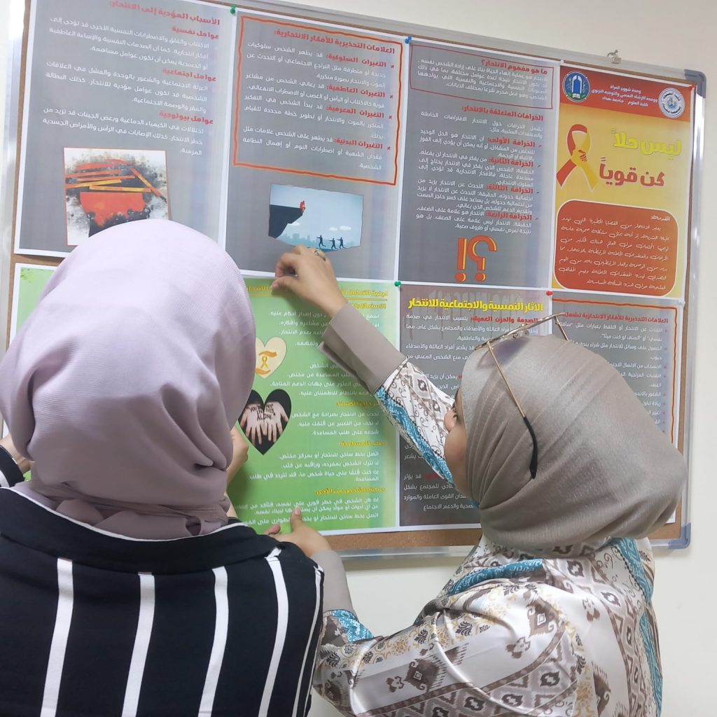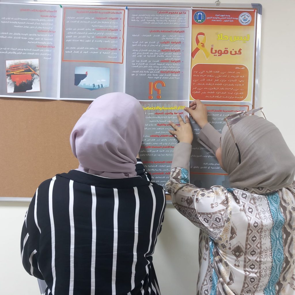 نظمت وحدة شؤون المرأة بالتعاون مع وحدات الإرشاد النفسي والتوجيه التربوي والتأهيل والتوظيف والمتابعة في كلية العلوم بجامعة بغداد، الحملة التوعوية الموسومة “ليس حلاً: كن قوياً” للتعريف بمخاطر الانتحار وأسبابه وتأثيراته السلبية على الفرد والعائلة والمجتمع.