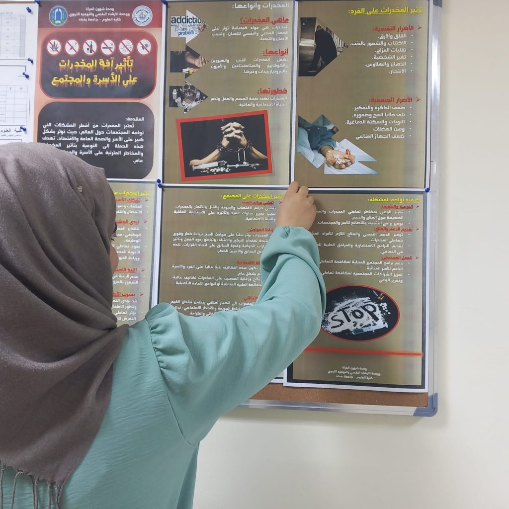 نظمت وحدة شؤون المرأة بالتعاون مع وحدتي الارشاد النفسي والتوجيه التربوي والتاهيل والتوظيف والمتابعة بكلية العلوم جامعة بغداد، حملة توعوية تحت عنوان “تأثير آفة المخدرات على الأسرة والمجتمع” وذلك في إطار تكثيف جهودها المستمرة للتوعية بالقضايا المجتمعية المهمة .