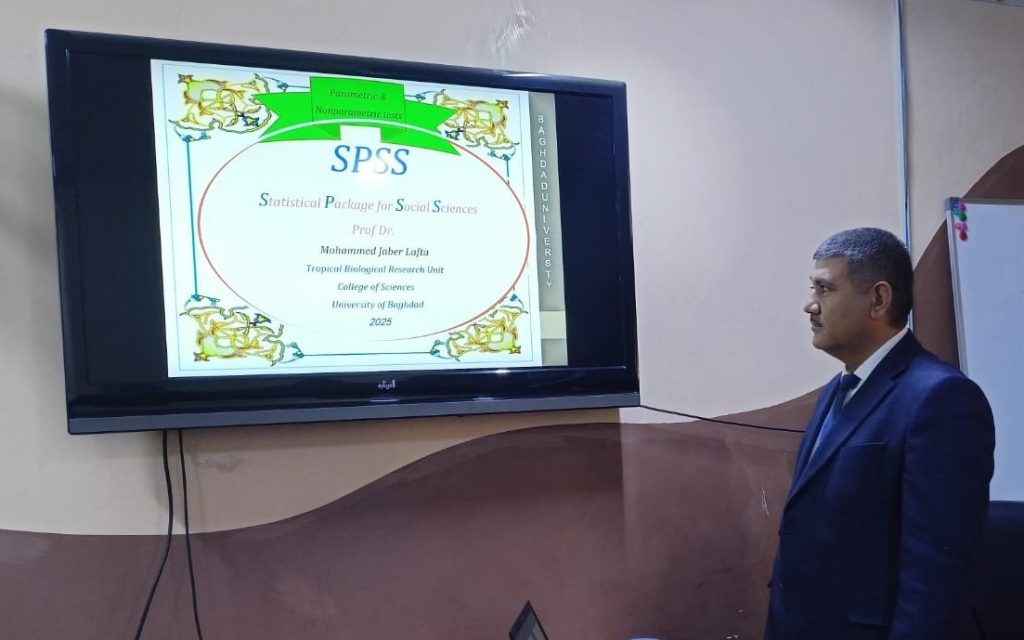 اقامت وحدة الابحاث البيولوجية للمناطق الحارة بالتعاون مع وحدة التعليم المستمر بكلية العلوم جامعة بغداد، ورشة عمل بعنوان “اساسيات مباديء الاحصاء باستخدام برنامج IBMSPSS” وذلك برعاية عميد الكلية الاستاذ المساعد الدكتور رائد فالح حسن، وحضور عدد من الطلبة والتدريسيين والمتخصيين بالاحصاء والرياضيات وبرامجيات الحاسوب.