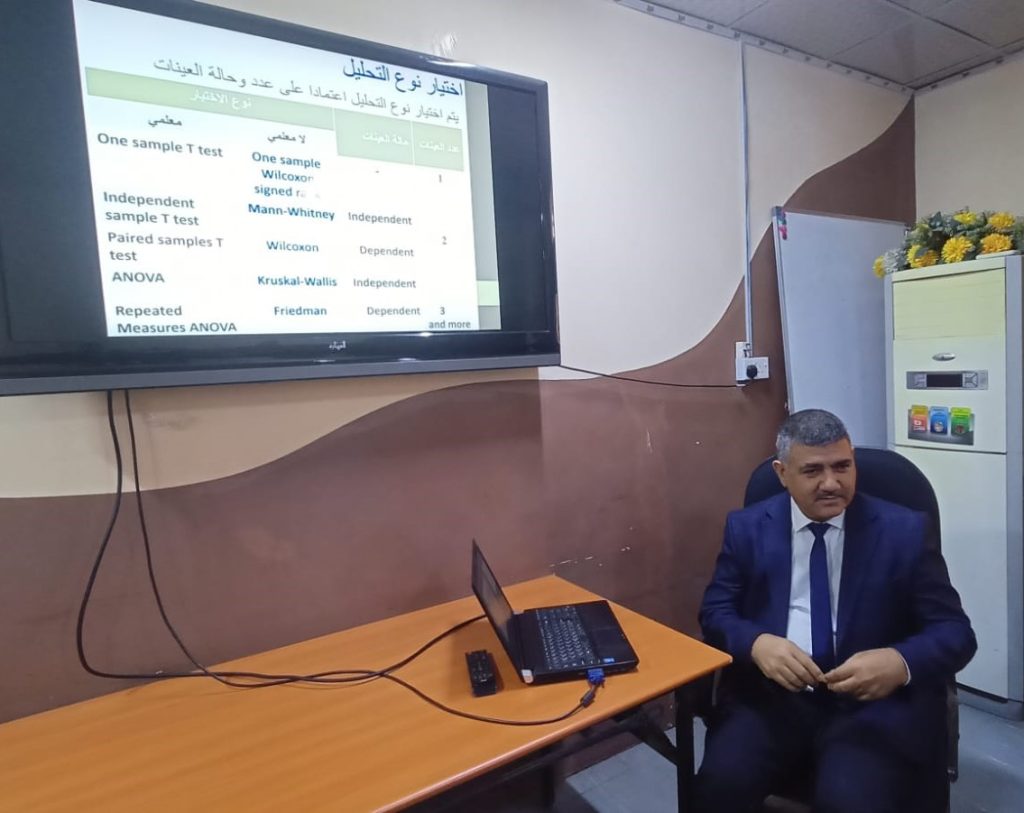 وتضمنت الورشة التي قدم محاضراتها كل من الاستاذة المساعدة الدكتورة فضاء عثمان والاستاذ الدكتور محمد جابر لفتة والاستاذ المساعد الدكتور علي حافظ عباس، تدريبا عمليا على استخدام برنامج IBM SPSS. والتعريف بالبرامج الأحصائية المستخدمة في تحليل البيانات وأنواع الاختبارات الإحصائية لكل نوع من البيانات فضلا عن توضيح حجم العينات الملائم للتجربة و أنواع الاختبارات الإحصائية المناسبة للبيانات المستحصلة بنوعيها المعلمية واللامعلمية، مع تقديم شرح عن انواع البيانات والاختبارات الخاصة بكل نوع وكيفية استخدام برنامج ال SPSS في إدخال البيانات وتحليلها والحصول على النتائج .