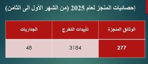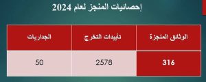 وفي عام 2025 من الشهر الأول حتى الشهر الثامن، أنجز 3184 تأييد تخرج، و 277 وثيقة، فضلا عن 48 جدارية.