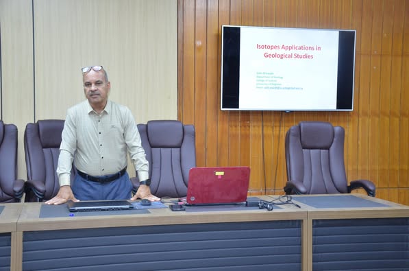 وهدفت المحاضرة التي قدمها الأستاذ الدكتور صالح محمد عوض، إلى فهم مبادئ النظائر المستقرة والمشعة وتطبيقاتها الأساسية في الجيولوجيا، بناء موديل البيئة والمناخ القديم من خلال تحديد درجات الحرارة وعمق المياه وموقع خط الساحل للبحار القديمة وفترات المناخ الجليدي والحار.