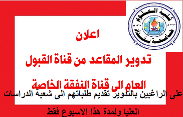 تعلن شعبة الدراسات العليا في كلية العلوم للطلبة المتقدمين للدراسات العليا والراغبين بتدوير مقاعدهم من العام الى الخاص، مراجعة الشعبة المذكورة في هذا الاسبوع حصرا